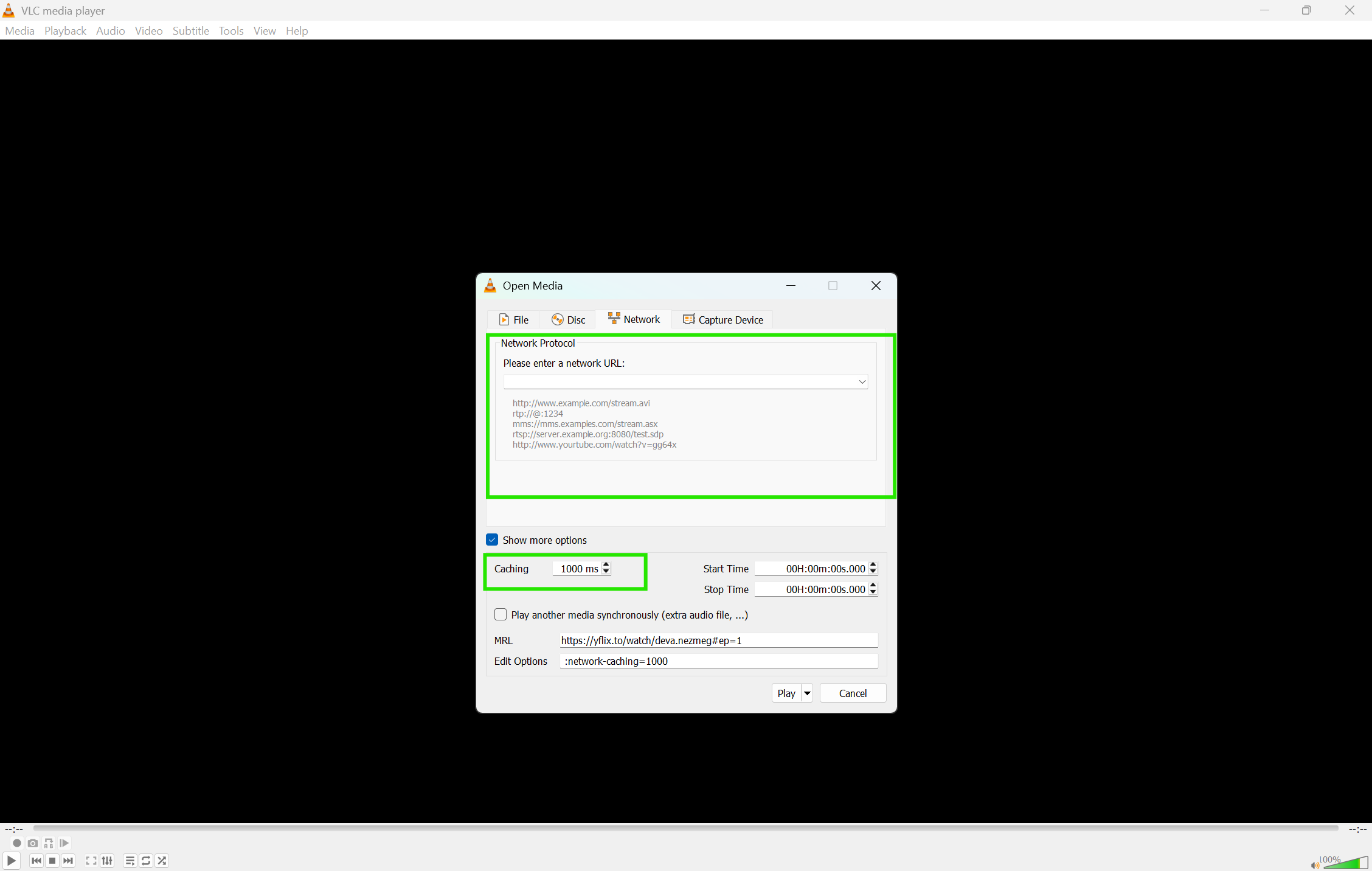 In the Open Network Stream window, select the "Show more options" checkbox.