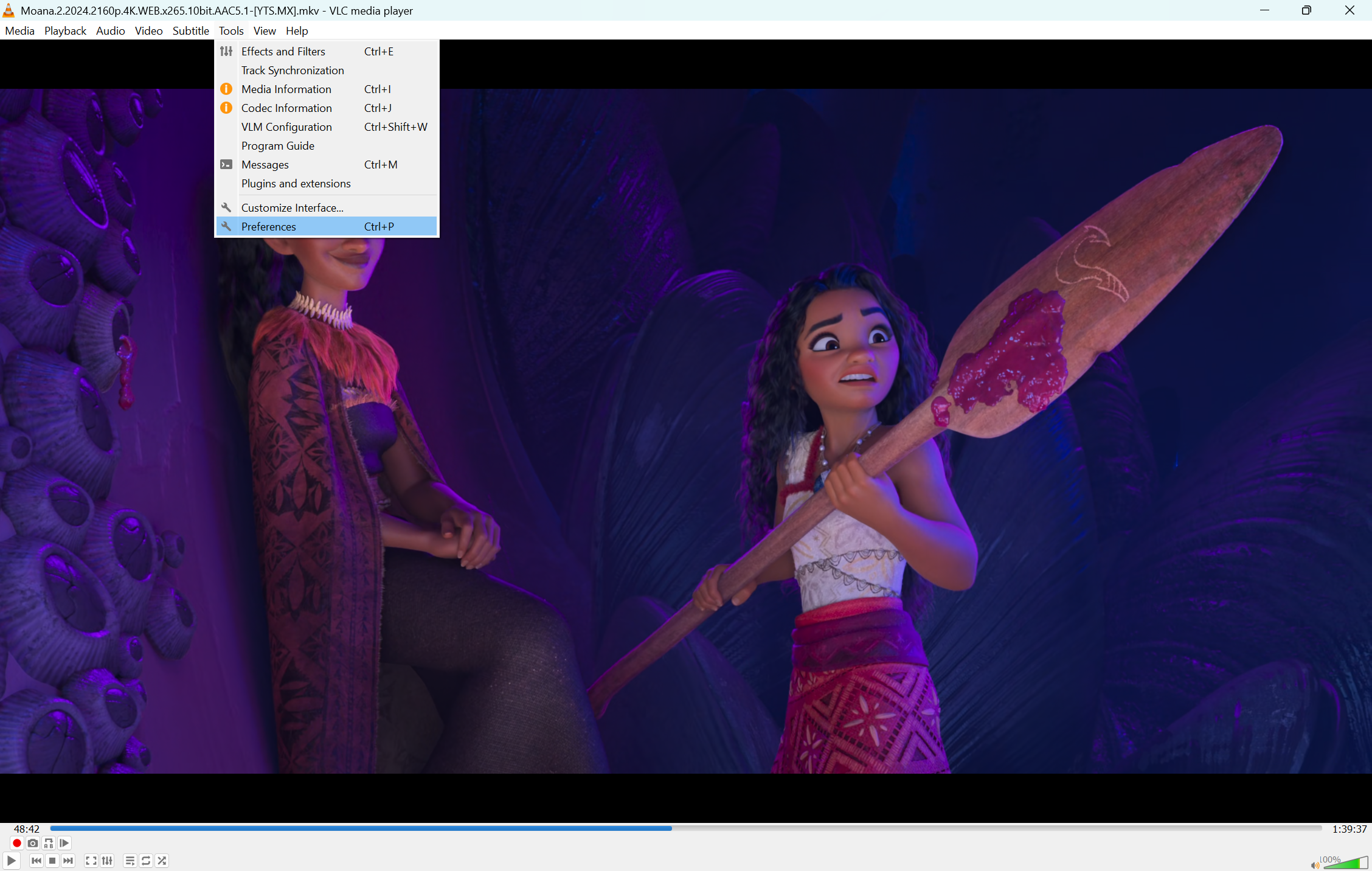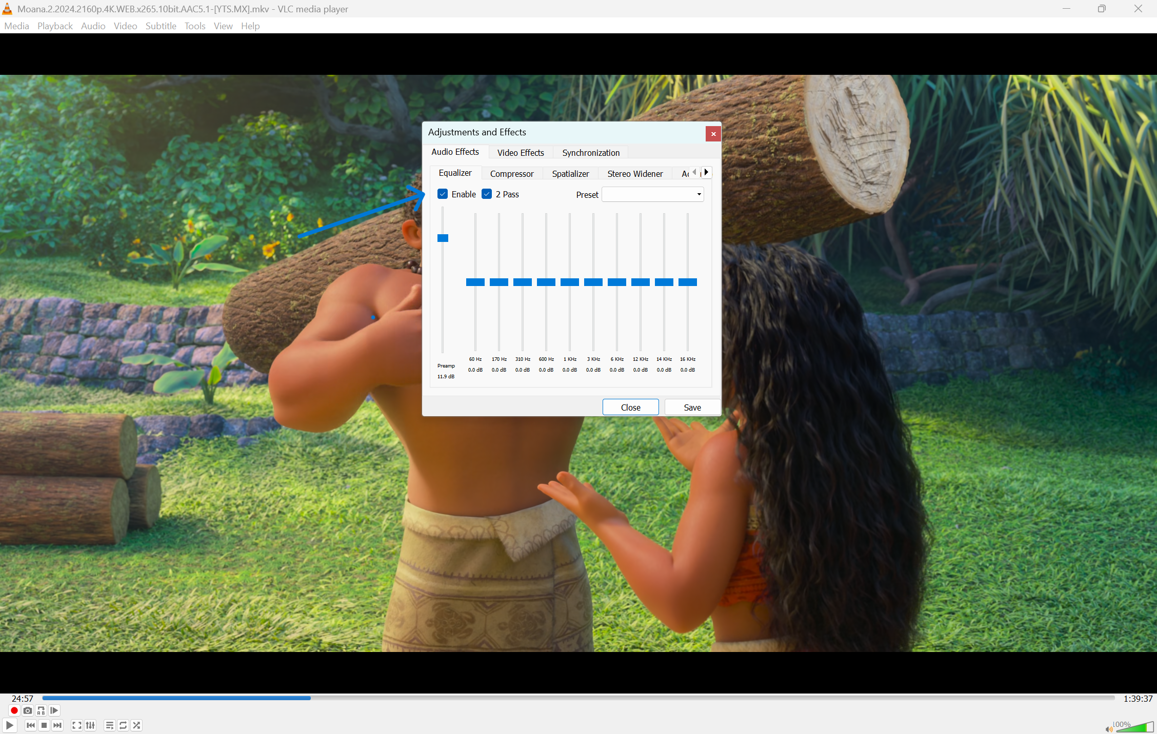 Once you are happy with the sound, you can simply close the Adjustments and Effects window. The settings stay active as long as VLC is open. If you want these settings to be the default every time you open the program: